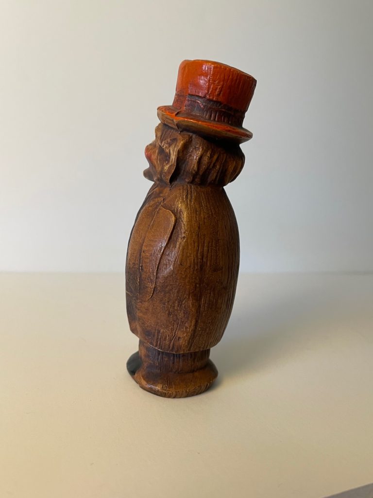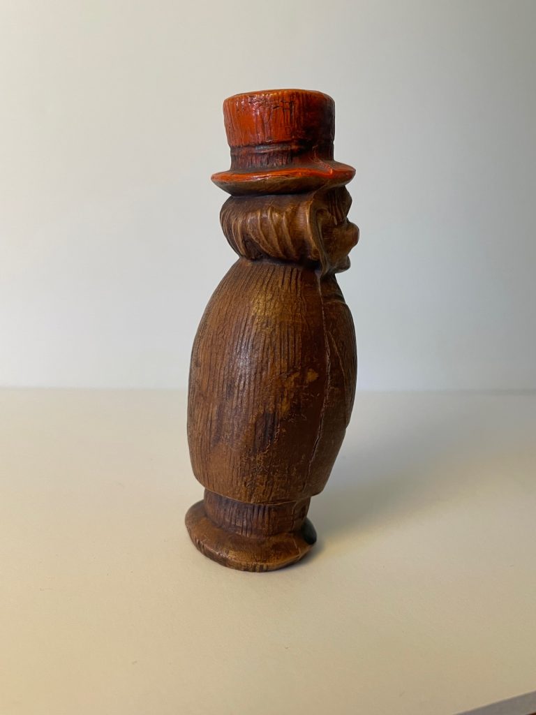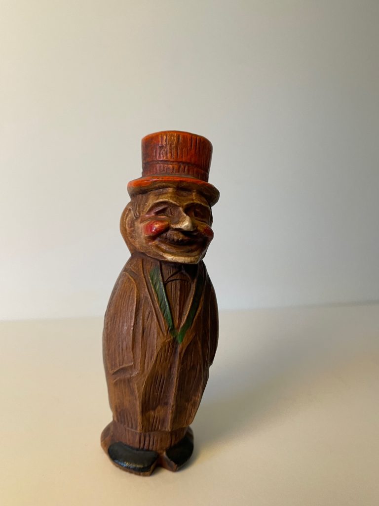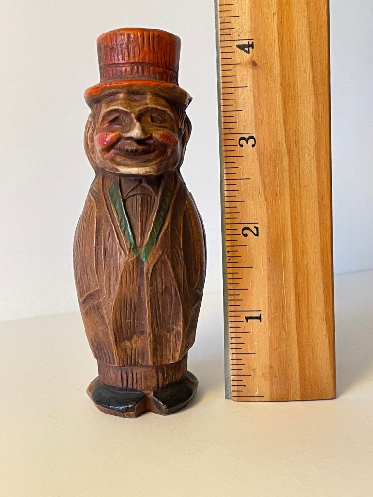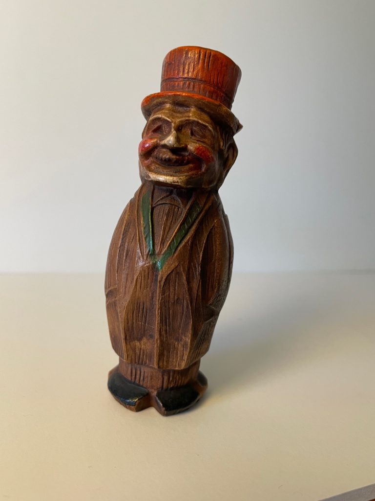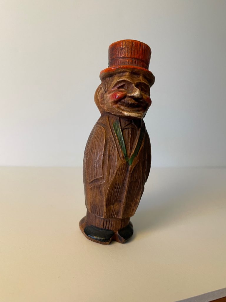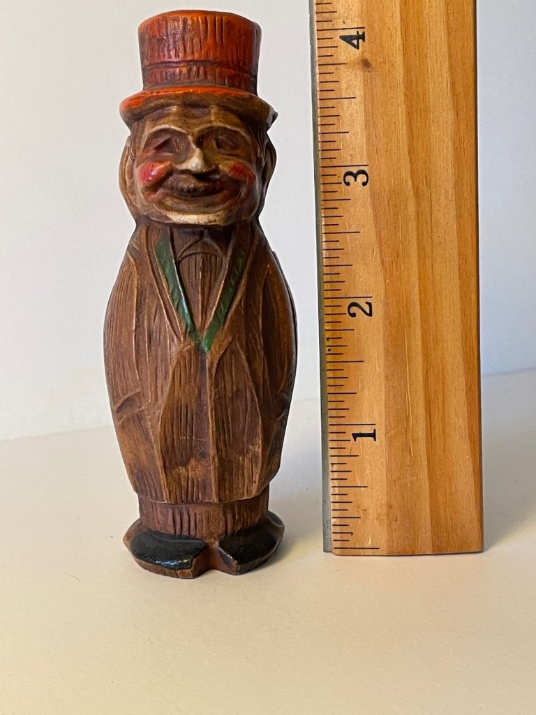 This is a vintage figurine of a happy little gent in long coat and top hat. He stands about 4-1/4″ tall, and seems to be leaning a little. Perhaps he made a stop on the way home at the pub, and that’s why he’s so happy. Asking $5 (plus shipping, where applicable).