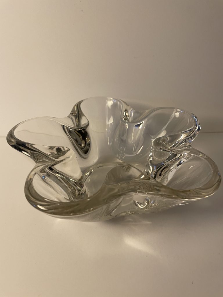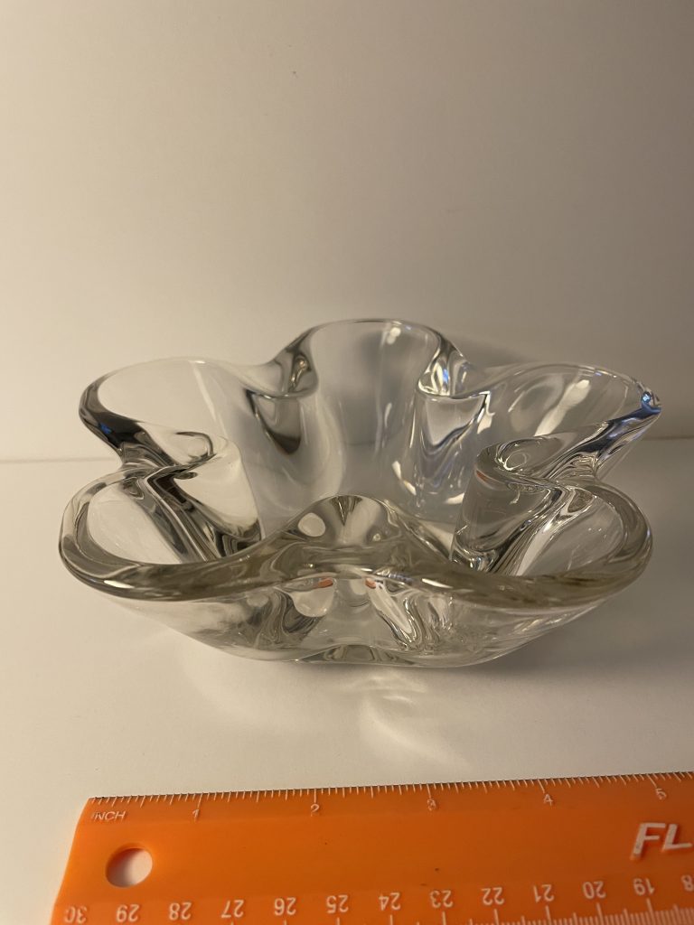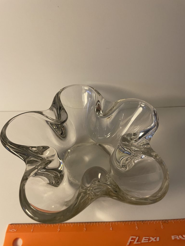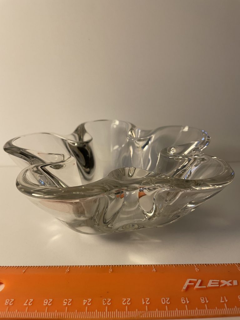 This sleek design could be used for candy, nuts, candle holder? It’s heavy, clear glass, and gorgeous! Approx. 2-1/2″ deep, and 7-1/2″ diameter. Check out the matching candle holders! Asking $25 (shipping extra).