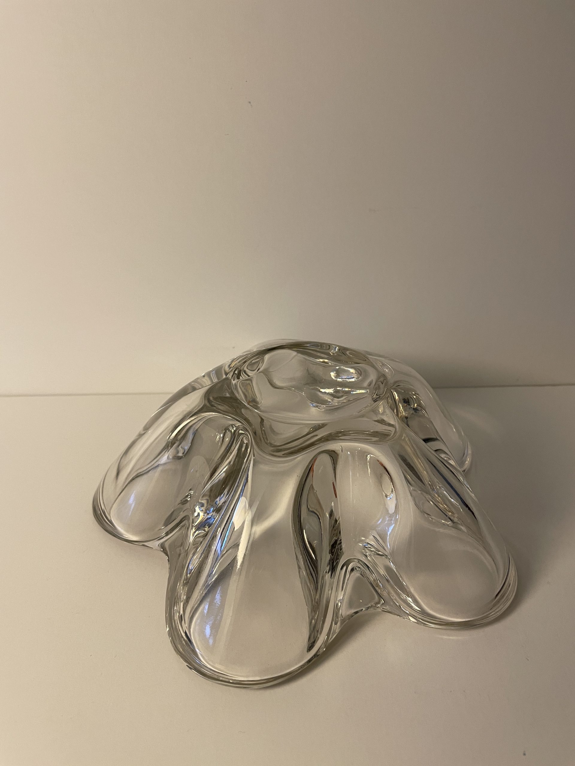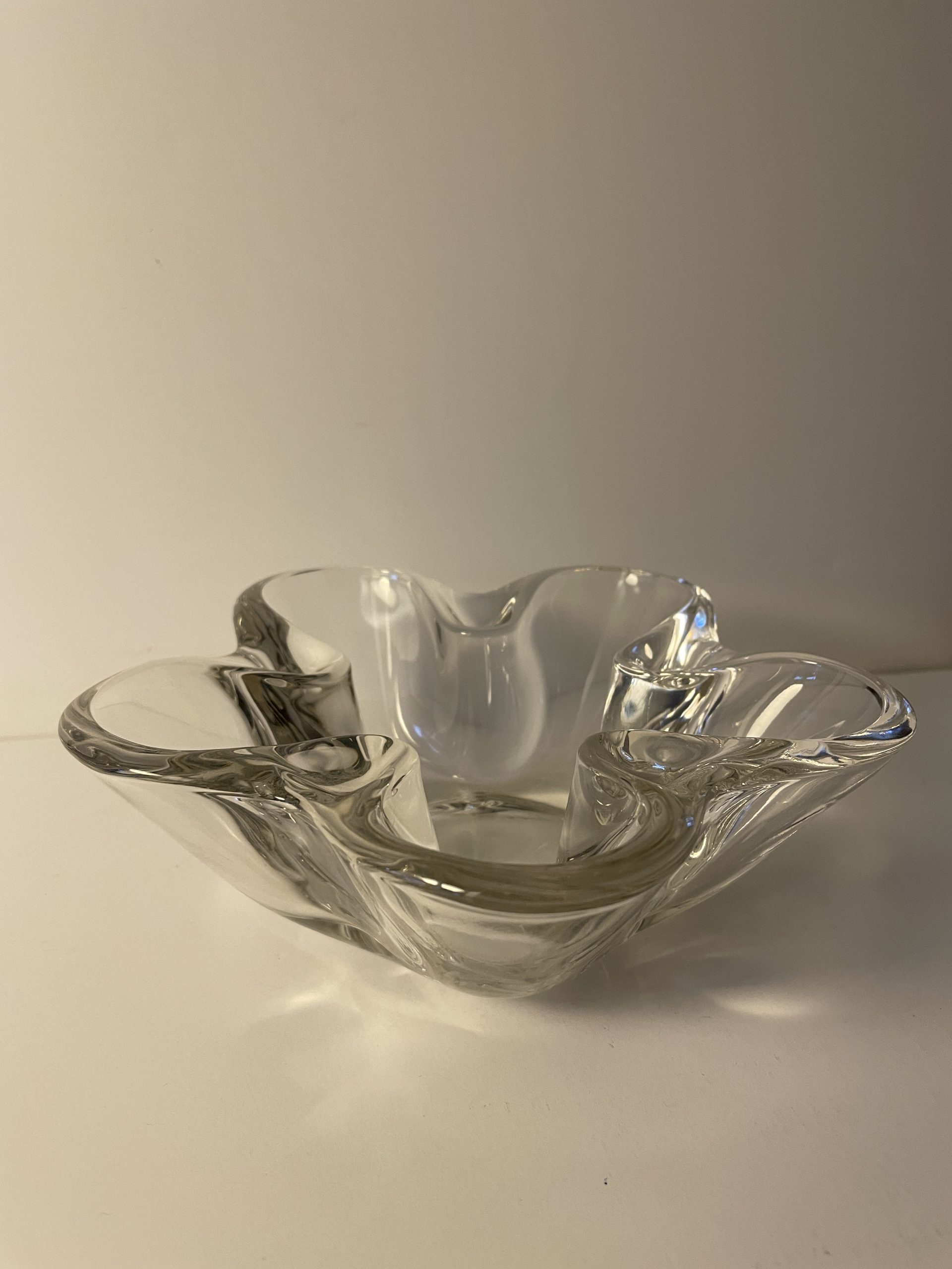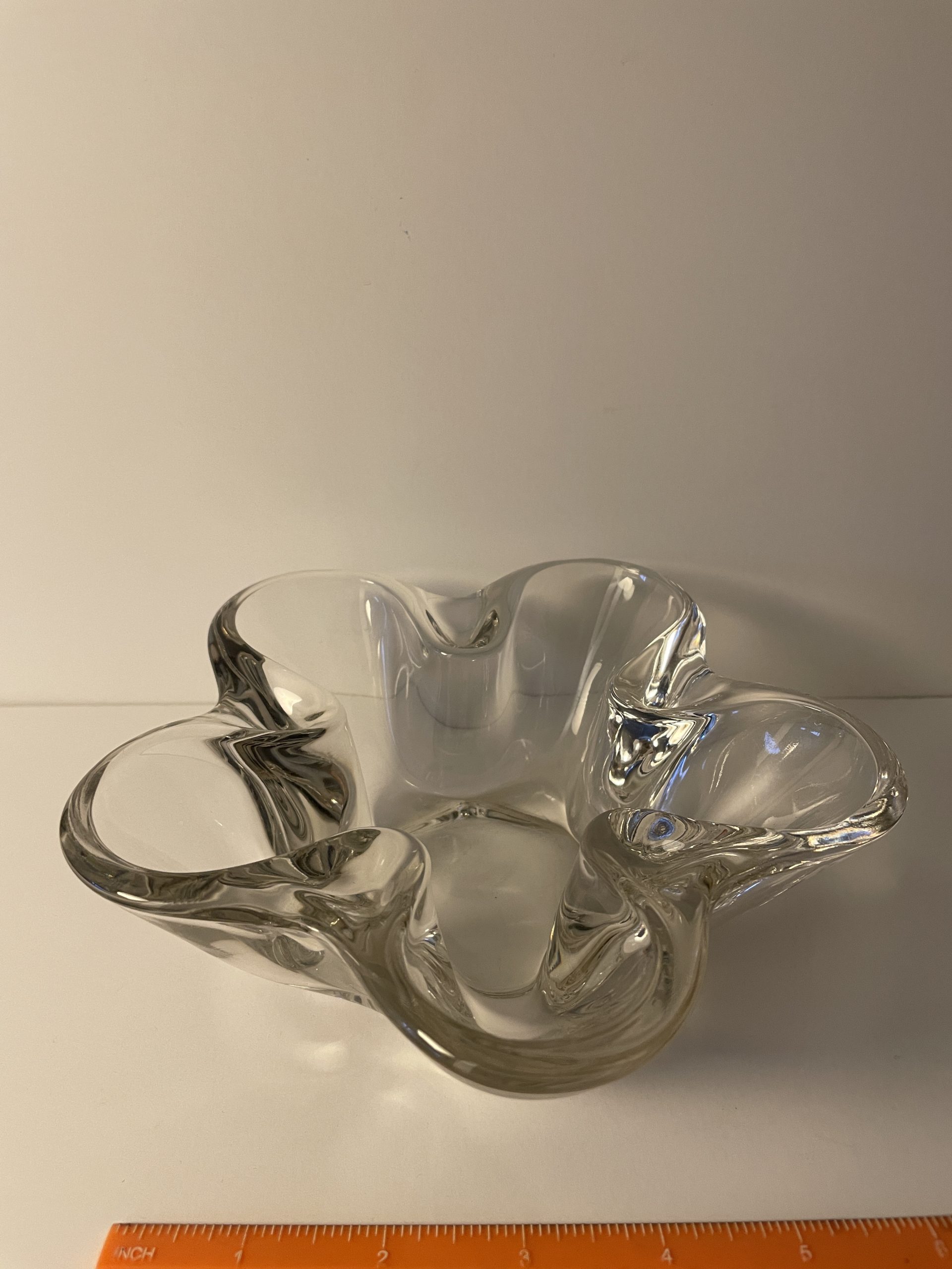 This sleek design could be used for candy, nuts, candle holder? It’s heavy, clear glass, and gorgeous! Approx. 2-1/2″ deep, and 7-1/2″ diameter. Check out the matching candle holders! Asking $25 (shipping extra).