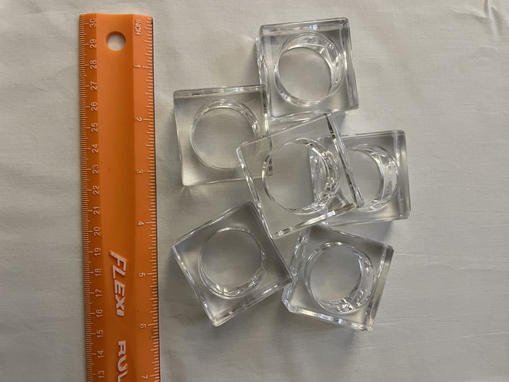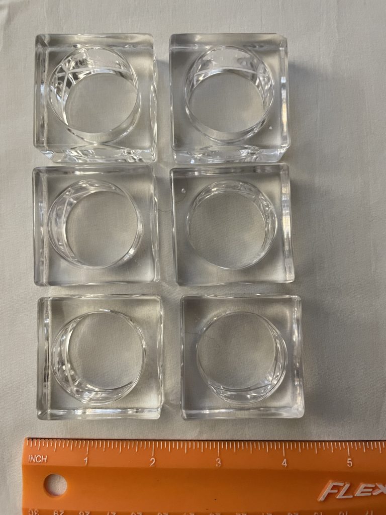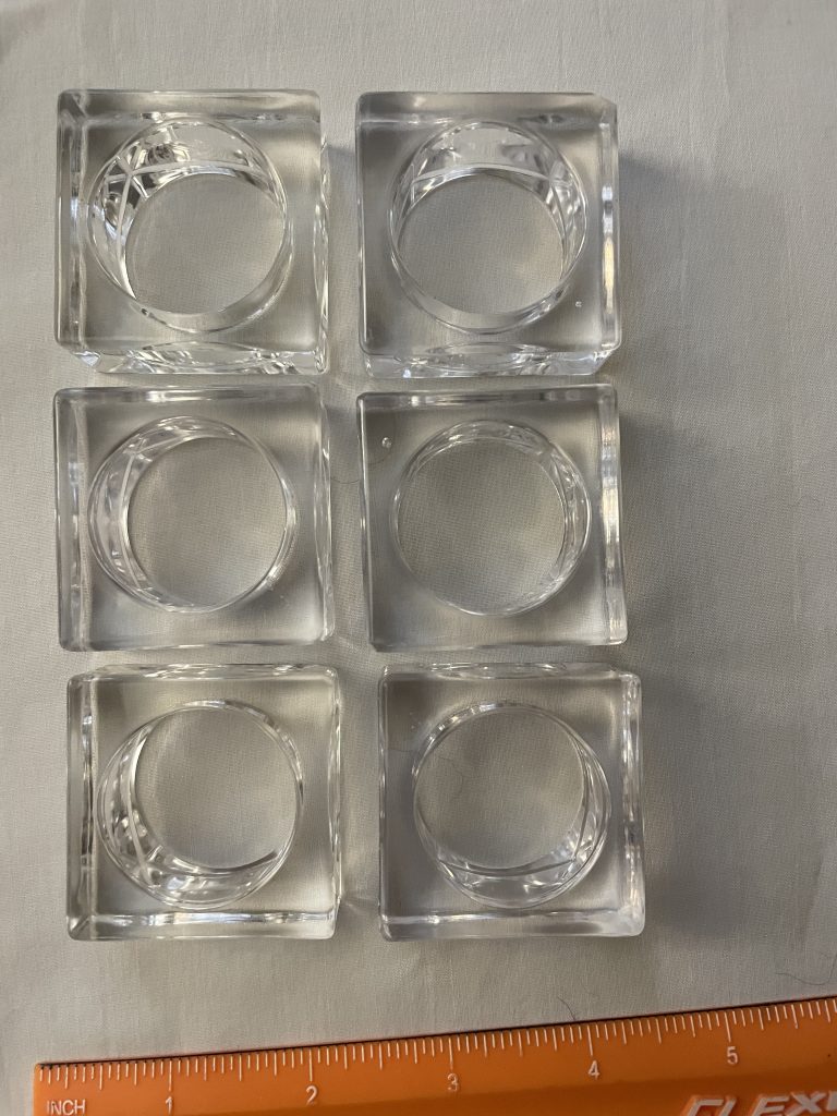 This stunning set of six mid-century modern napkin holders date from US ca. 1970. They feature square bodies in translucent lucite with circular cut outs in the center of each. With their clean, modernist lines, these napkin ring holders are ready for any tablescape. They are in excellent vintage condition, save one (photographed) with a slight corner chip. Each measures approx. 1-3/4″ square by 1/2″ high. Asking $60 (shipping not included).