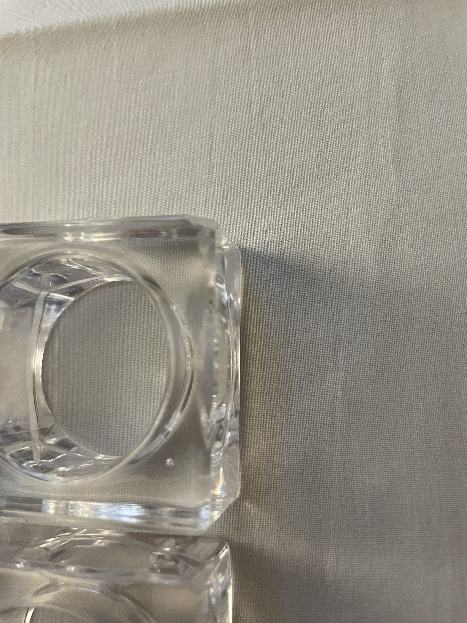 This stunning set of six mid-century modern napkin holders date from US ca. 1970. They feature square bodies in translucent lucite with circular cut outs in the center of each. With their clean, modernist lines, these napkin ring holders are ready for any tablescape. They are in excellent vintage condition, save one (photographed) with a slight corner chip. Each measures approx. 1-3/4″ square by 1/2″ high. Asking $60 (shipping not included).