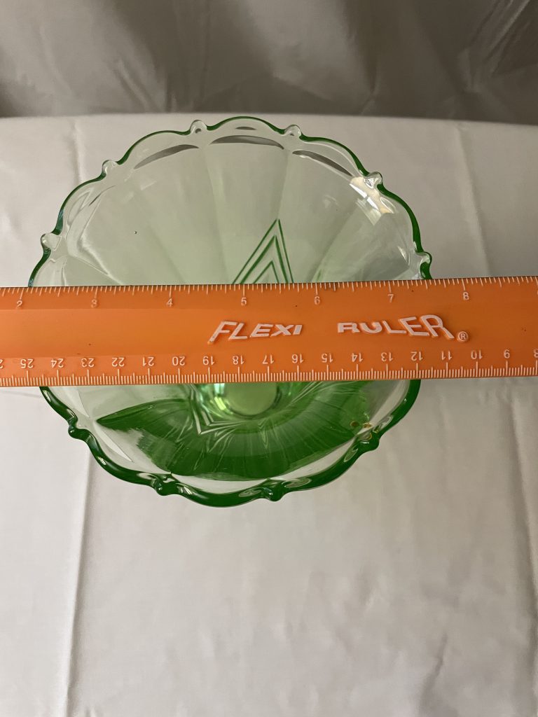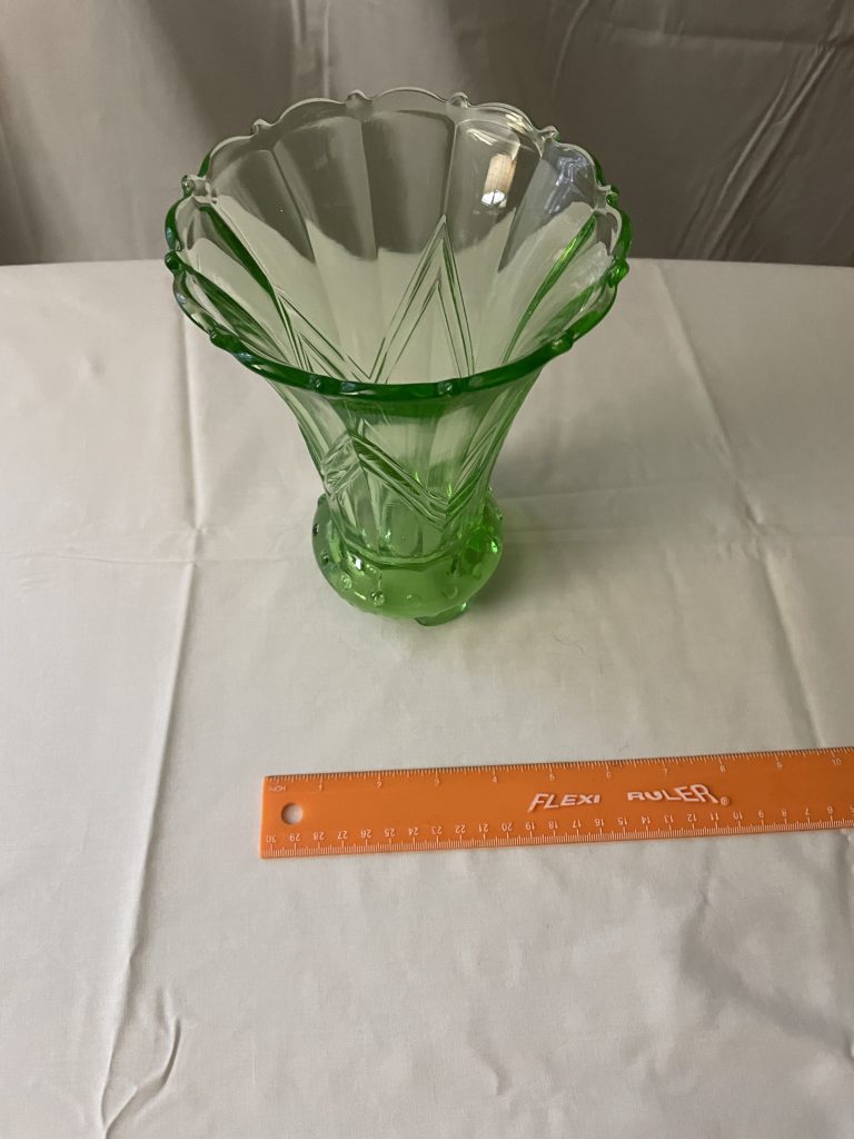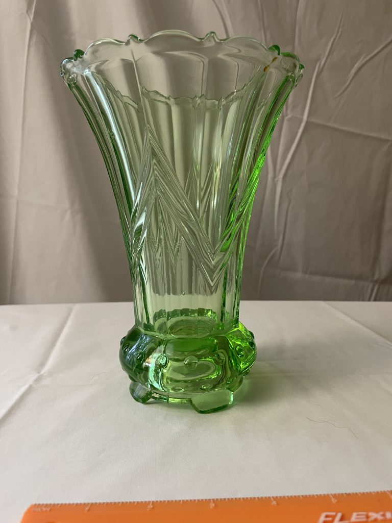 This beautiful vase with a chevron design below the frilled collar, and dots on the footed base, stands approximately eight inches tall, and has a mouth of approximately 5-1/2″ across. The green glass is vibrant, and UV light reactive. This vintage item is in excellent condition. Asking $125 (shipping not included).