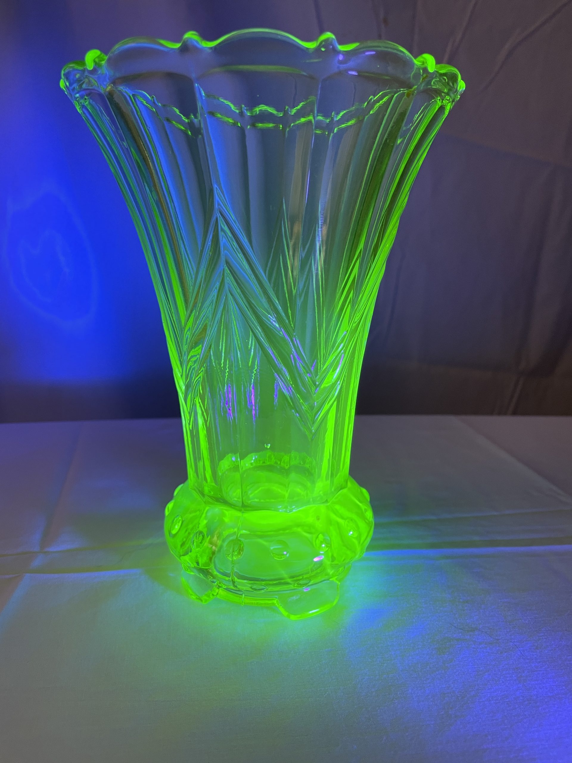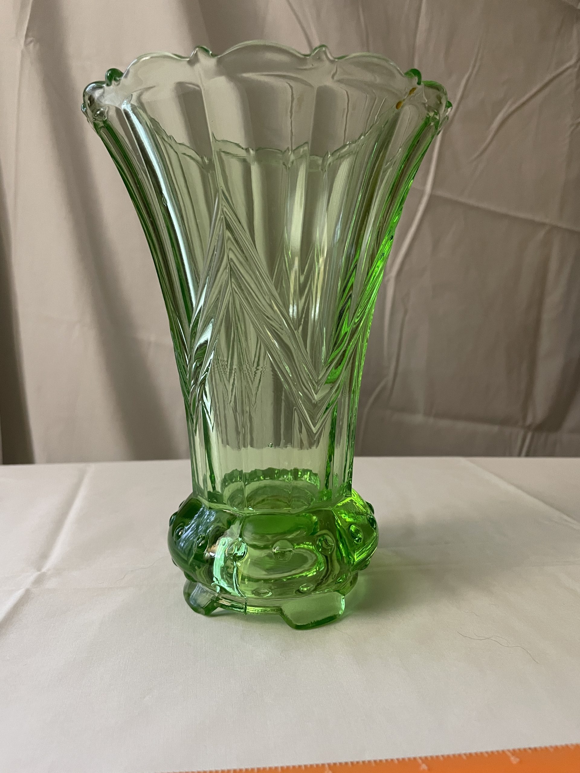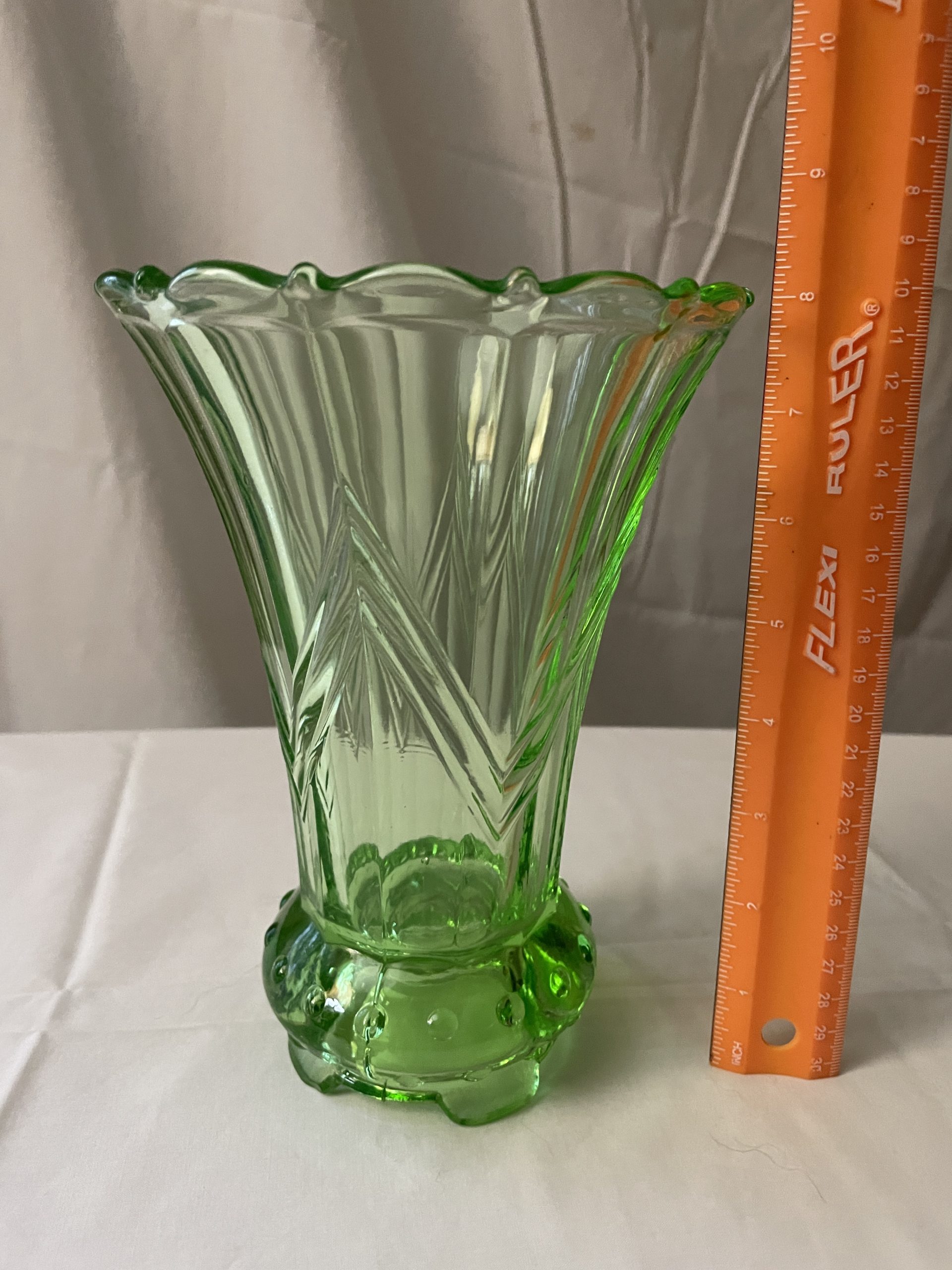 This beautiful vase with a chevron design below the frilled collar, and dots on the footed base, stands approximately eight inches tall, and has a mouth of approximately 5-1/2″ across. The green glass is vibrant, and UV light reactive. This vintage item is in excellent condition. Asking $125 (shipping not included).