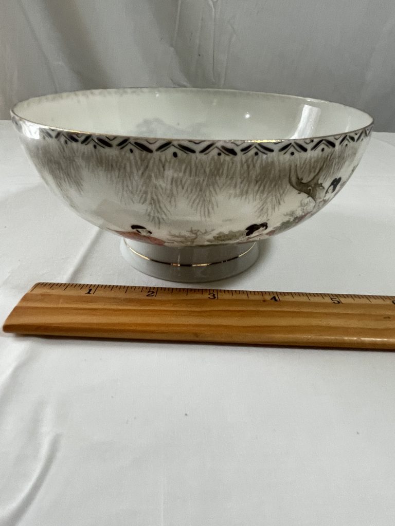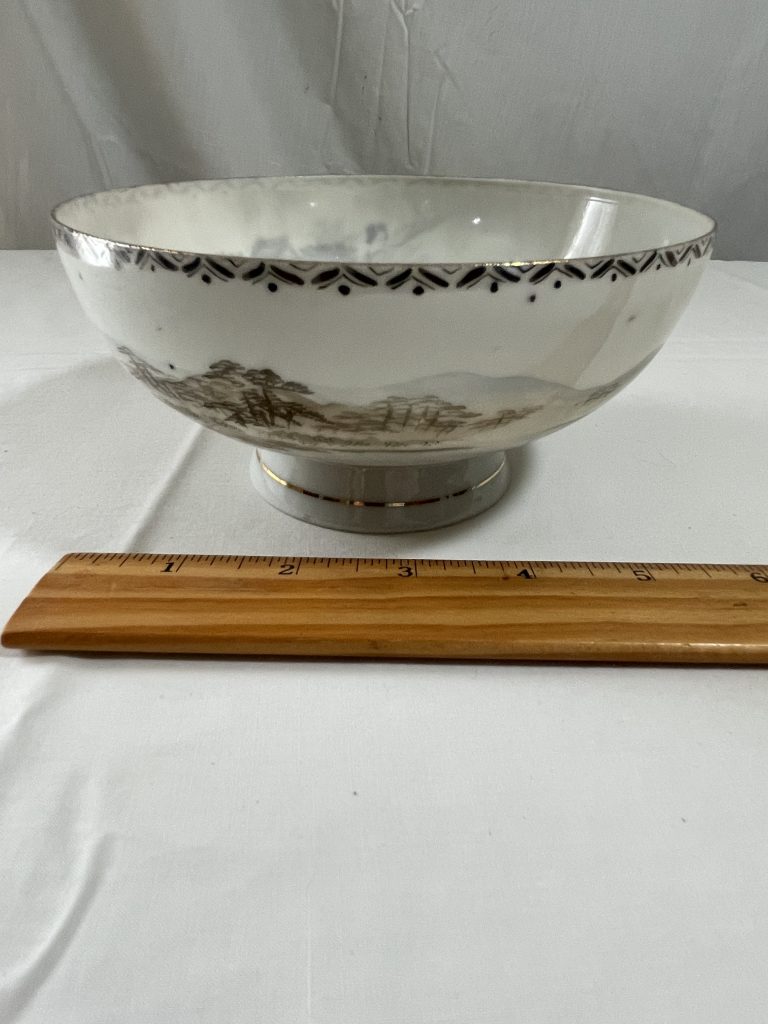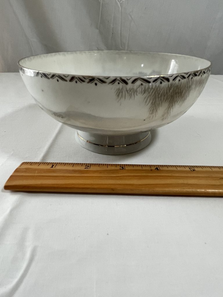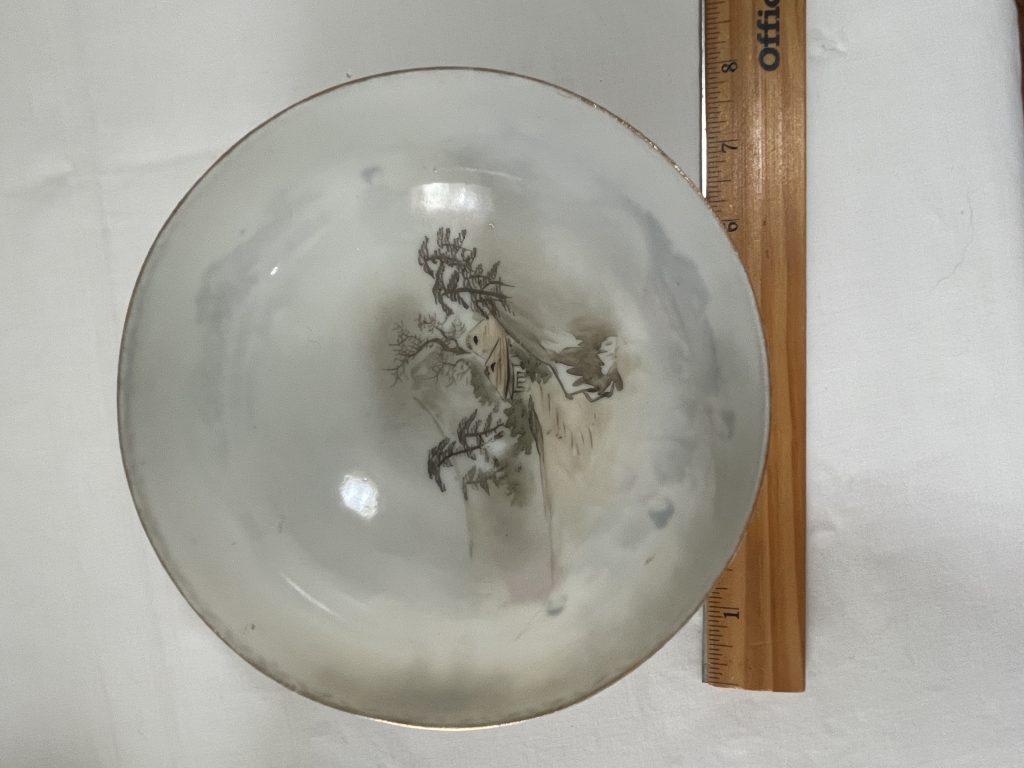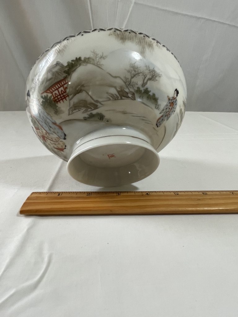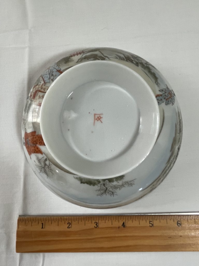 Hand-painted with a mountain hut scene in the center of the bowl, the exterior is hand painted with characters in kimonos, and pagoda with the mountain background continuing around the bowl. The raised base is delicately banded in gold. The bowl measures approximately 6″ at its widest point, and stands approximately 2-3/4″ high. Delicately hand-decorated in great detail. This is extremely thin porcelain with no chips or cracks or crazing. Asking $40 (shipping not included).