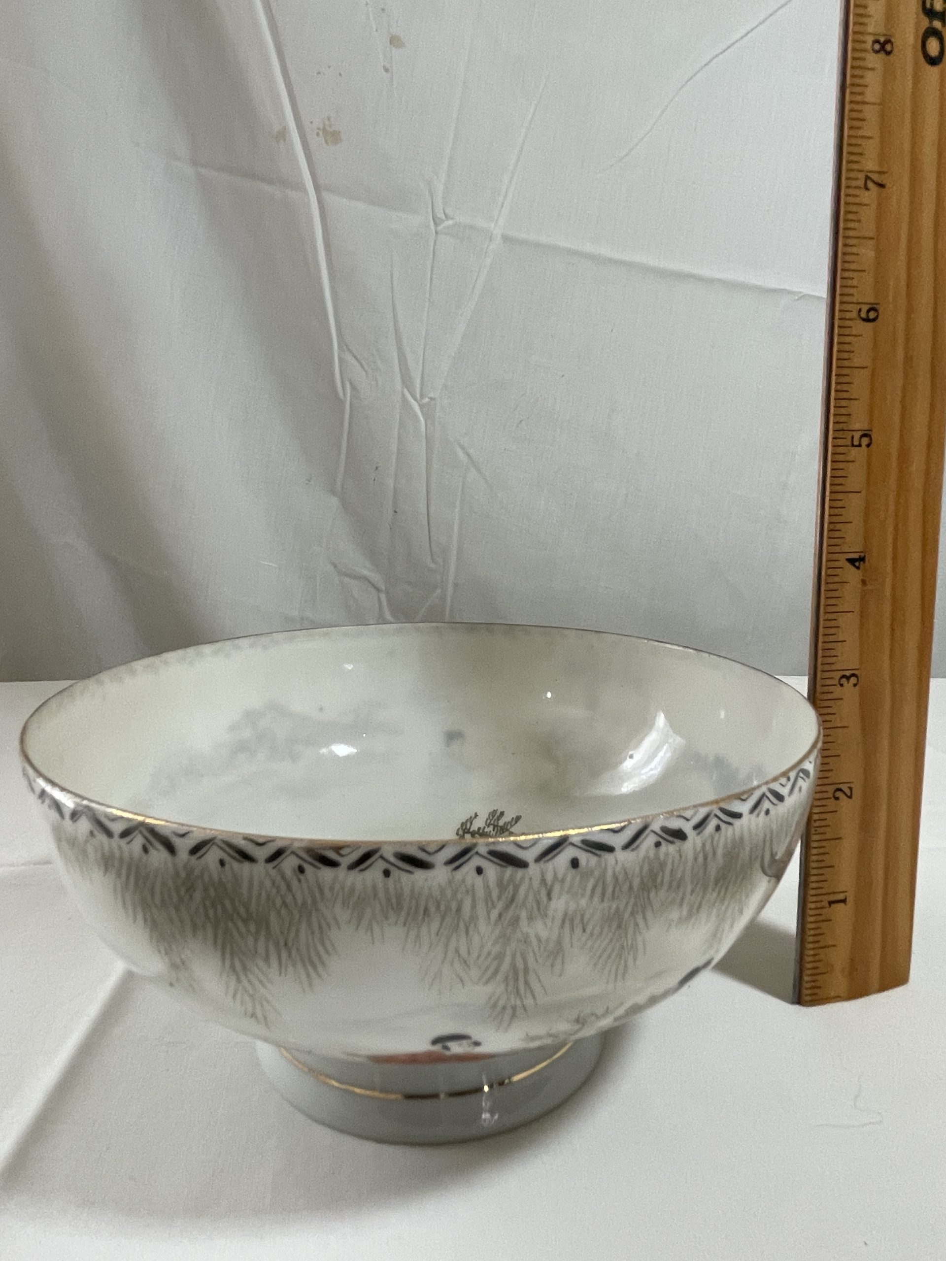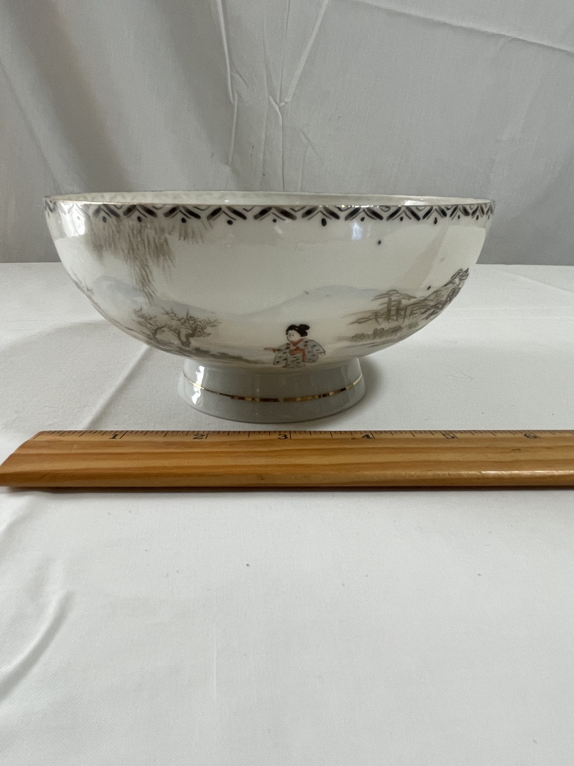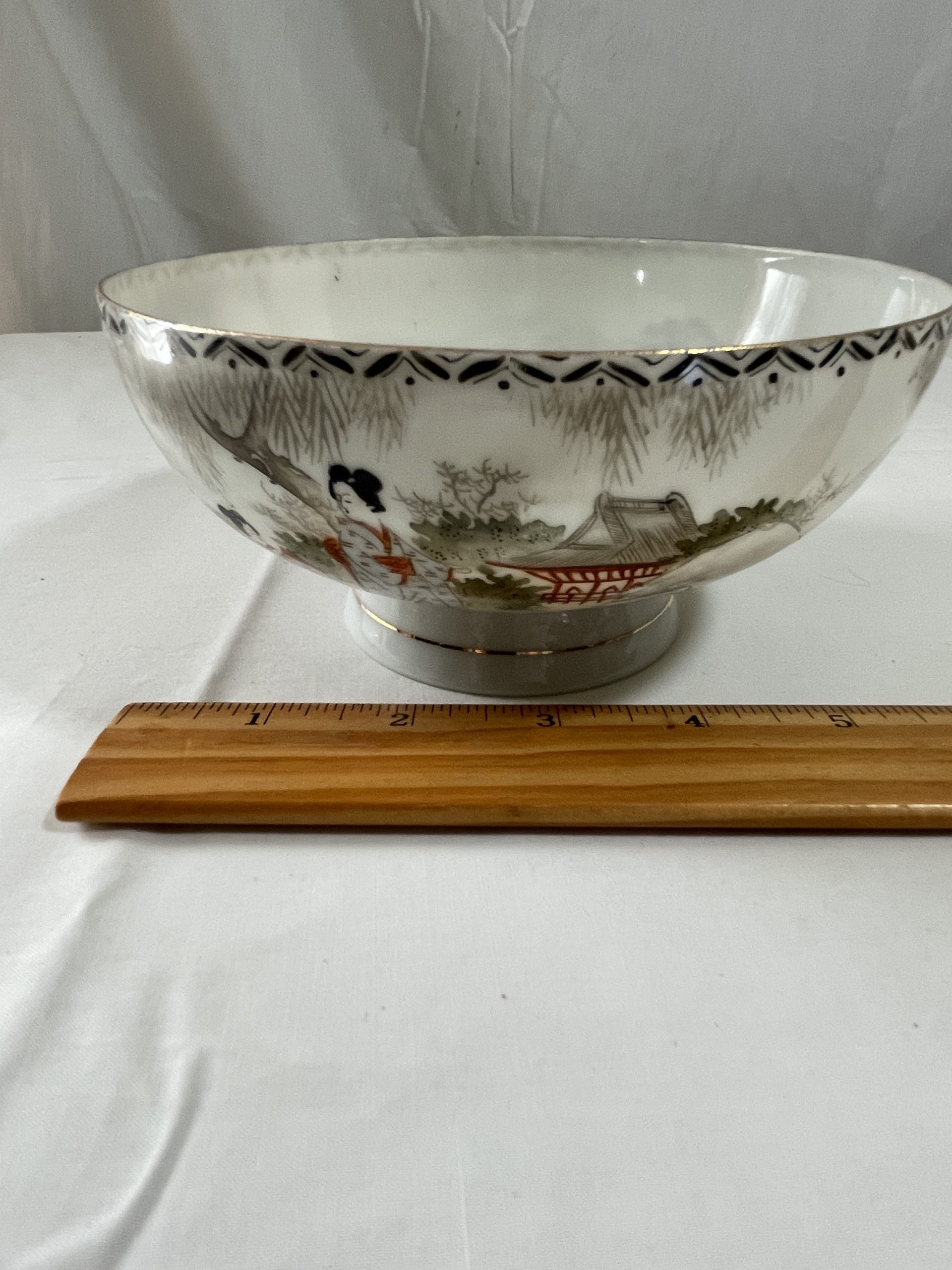 Hand-painted with a mountain hut scene in the center of the bowl, the exterior is hand painted with characters in kimonos, and pagoda with the mountain background continuing around the bowl. The raised base is delicately banded in gold. The bowl measures approximately 6″ at its widest point, and stands approximately 2-3/4″ high. Delicately hand-decorated in great detail. This is extremely thin porcelain with no chips or cracks or crazing. Asking $40 (shipping not included).