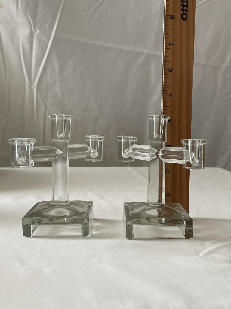 These crystal-clear candle holders are unmarked, and show no sign of use, but are known to date to at least the mid-20th century; perhaps as early as the Art Deco era. Without being overpowering as candelabra, nor blocking views to your dinner partners, they would lend just the perfect accent and light to any tablescape. They measure just 2-1/2″ square at the base (each), and 4-1/2″ at the top of the highest candle holder top. Candles of 1/4″ to 3/8″ diameter are called for in this set. Asking $50 (shipping not included).