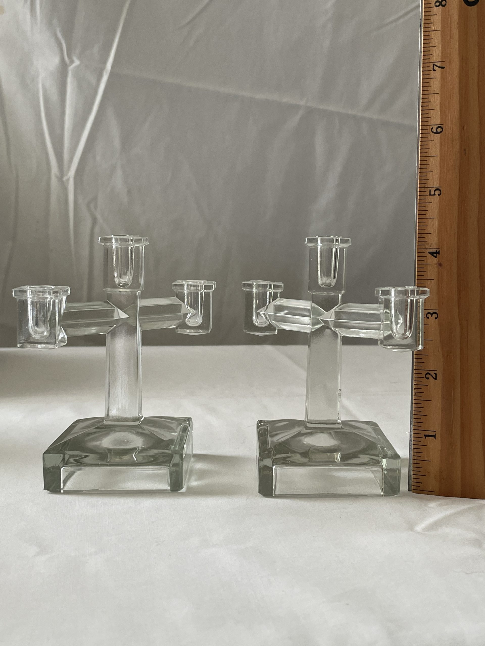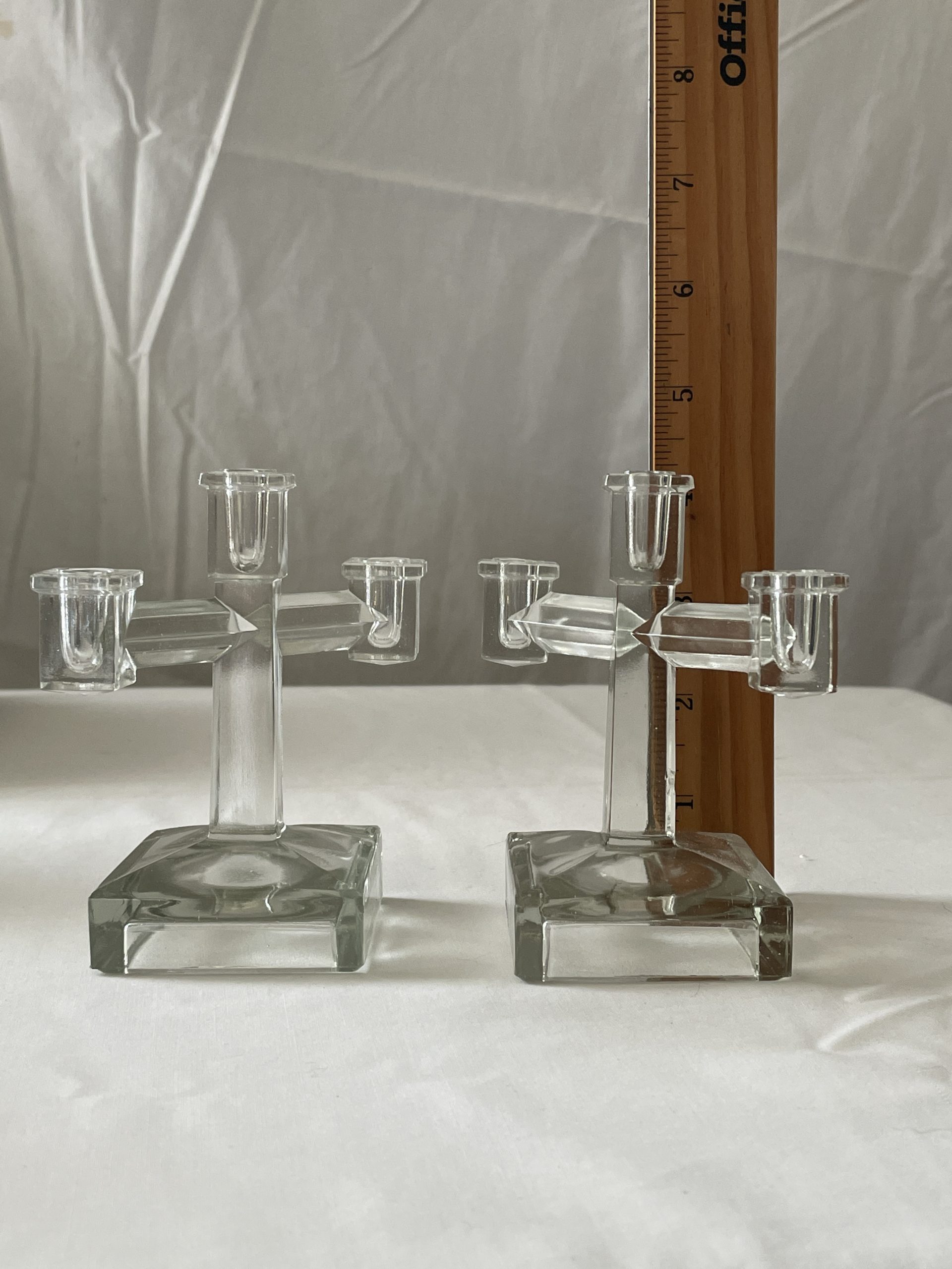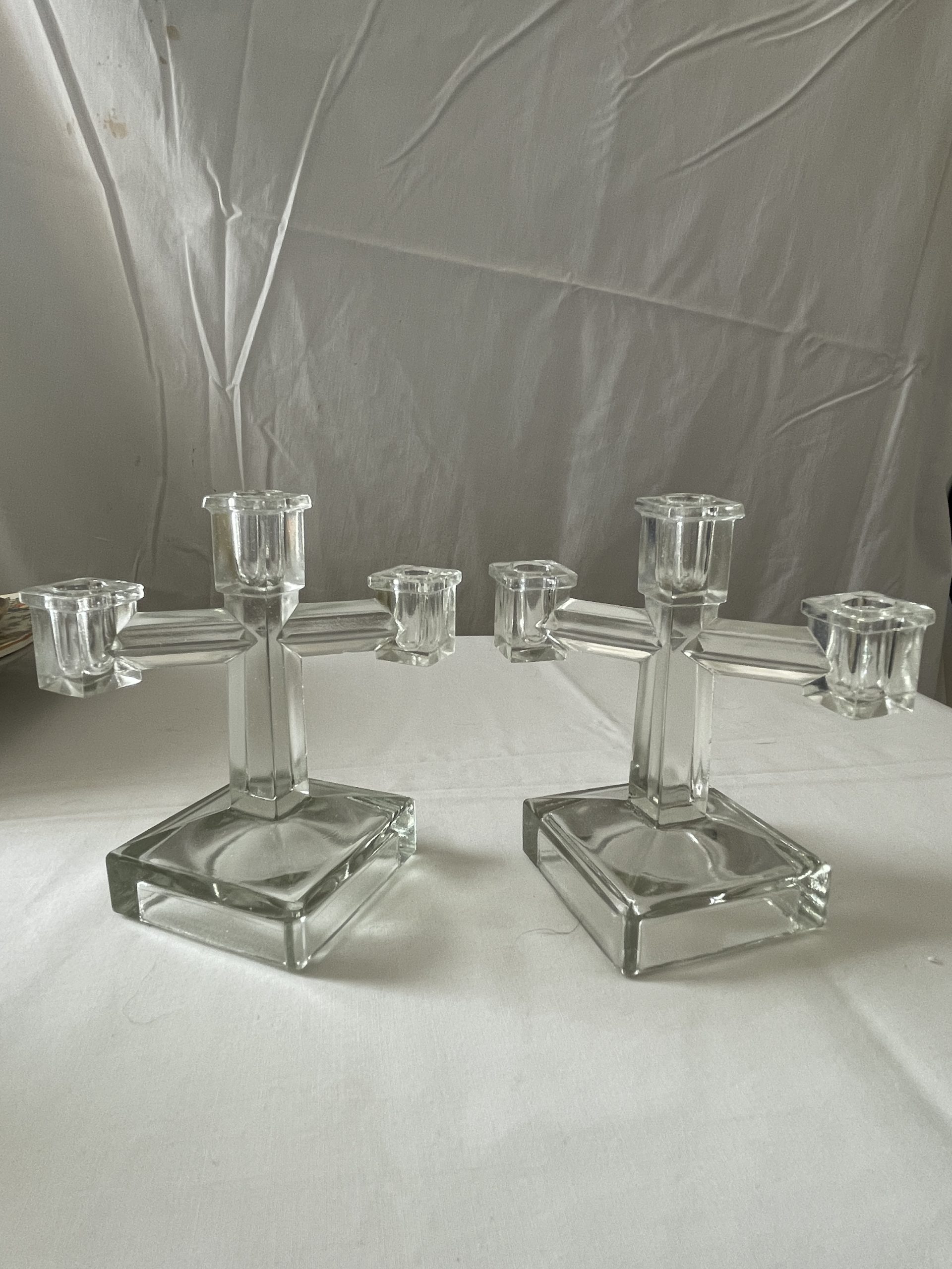 These crystal-clear candle holders are unmarked, and show no sign of use, but are known to date to at least the mid-20th century; perhaps as early as the Art Deco era. Without being overpowering as candelabra, nor blocking views to your dinner partners, they would lend just the perfect accent and light to any tablescape. They measure just 2-1/2″ square at the base (each), and 4-1/2″ at the top of the highest candle holder top. Candles of 1/4″ to 3/8″ diameter are called for in this set. Asking $50 (shipping not included).
