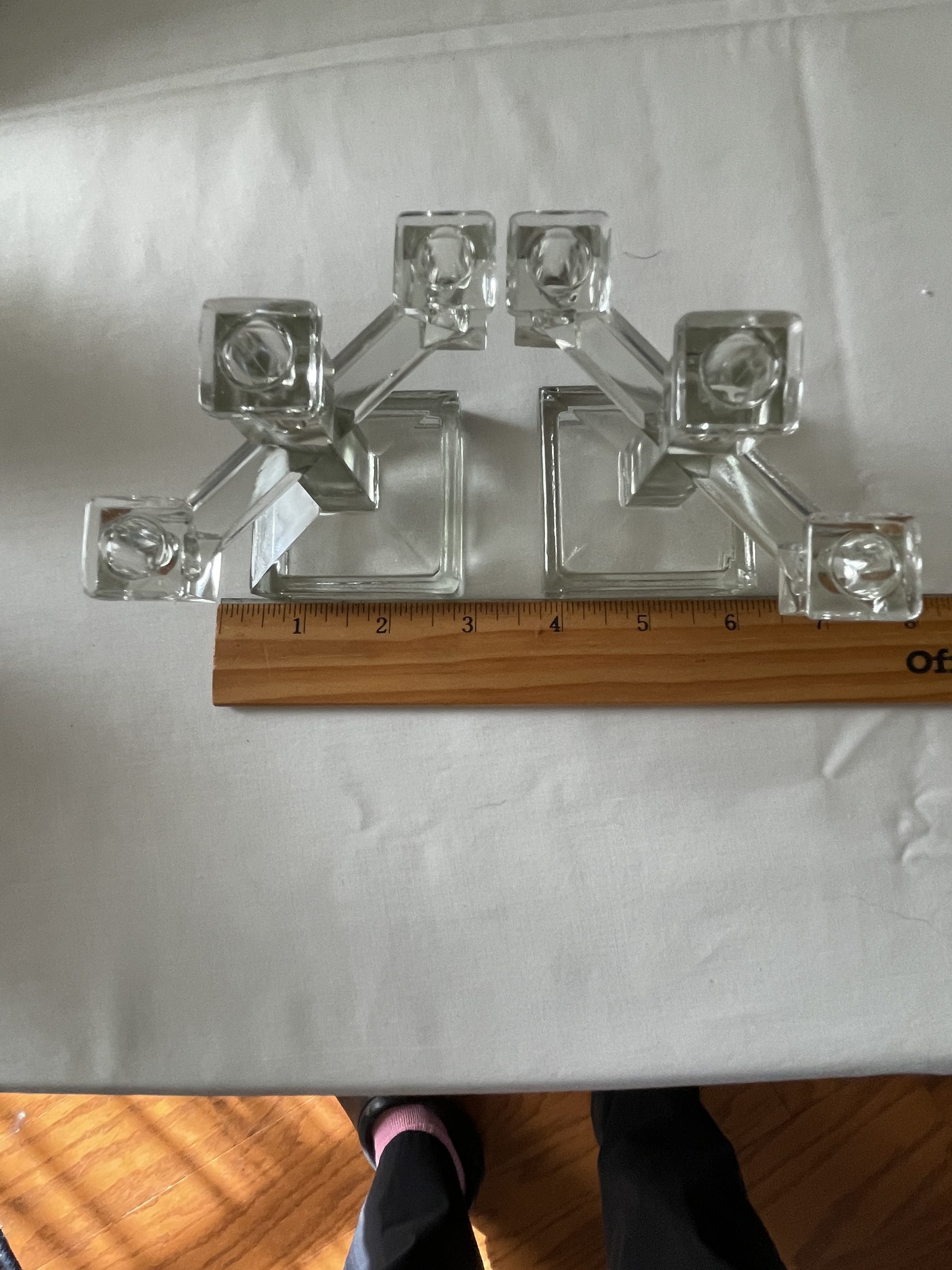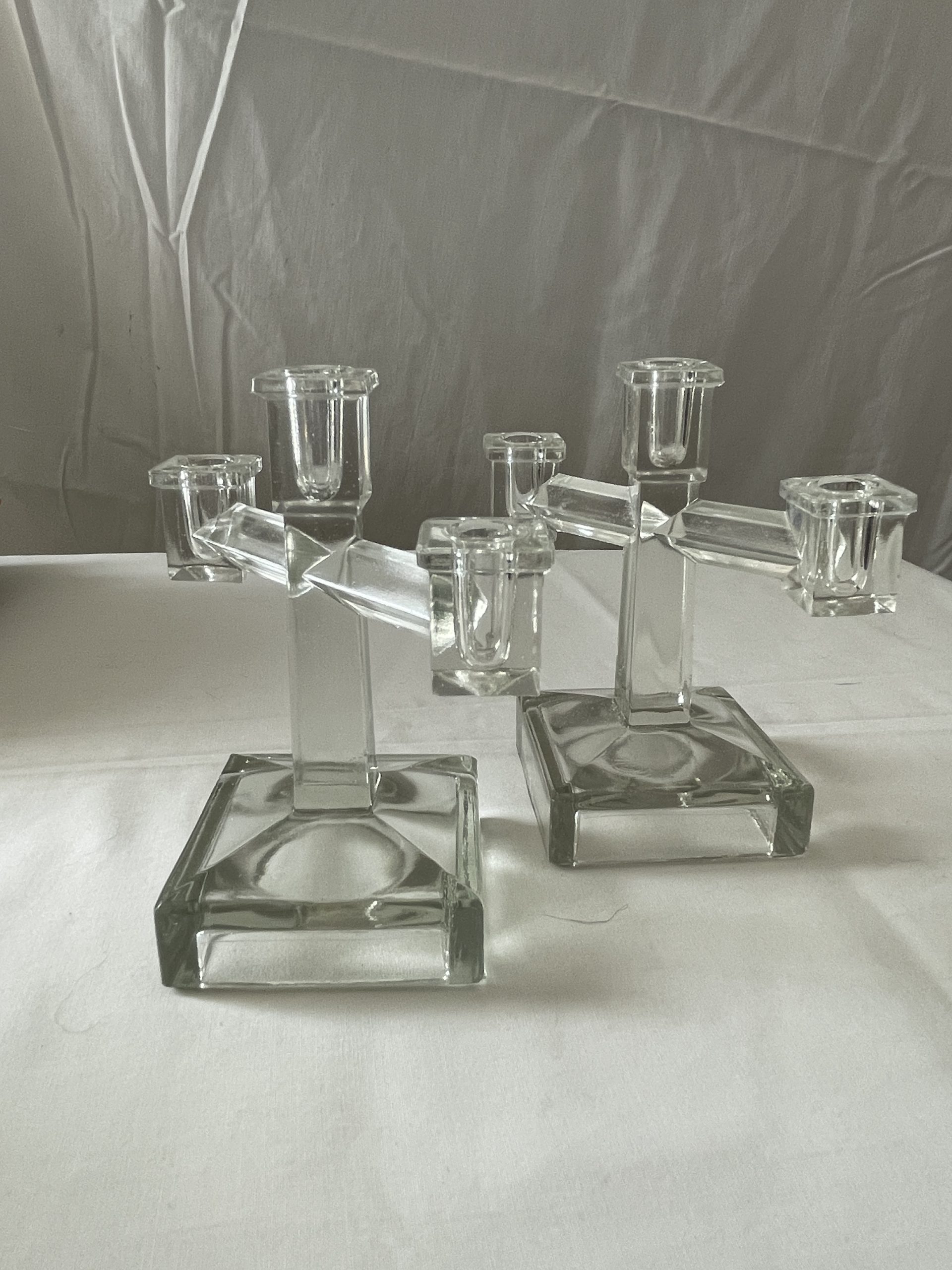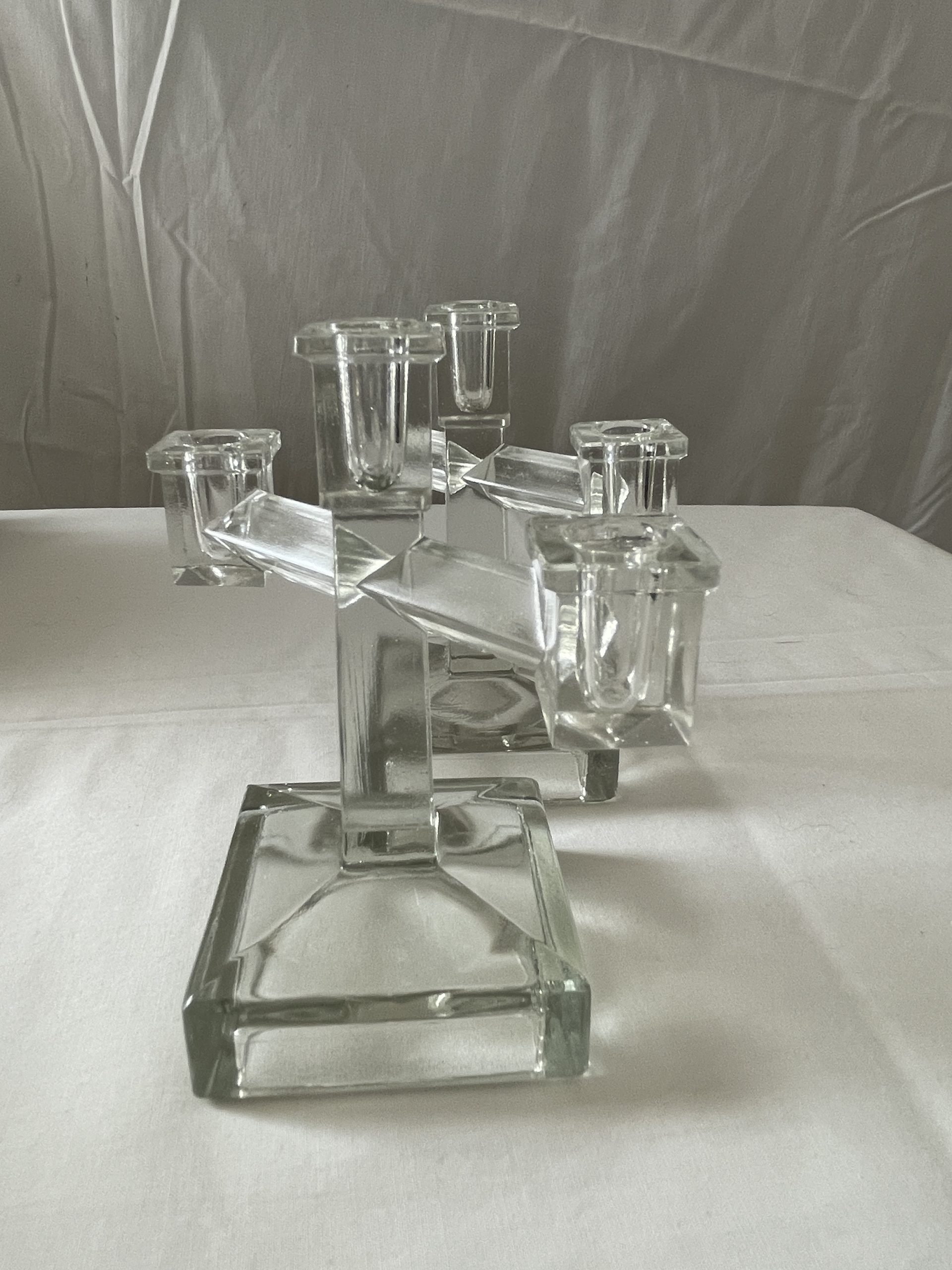 These crystal-clear candle holders are unmarked, and show no sign of use, but are known to date to at least the mid-20th century; perhaps as early as the Art Deco era. Without being overpowering as candelabra, nor blocking views to your dinner partners, they would lend just the perfect accent and light to any tablescape. They measure just 2-1/2″ square at the base (each), and 4-1/2″ at the top of the highest candle holder top. Candles of 1/4″ to 3/8″ diameter are called for in this set. Asking $50 (shipping not included).
