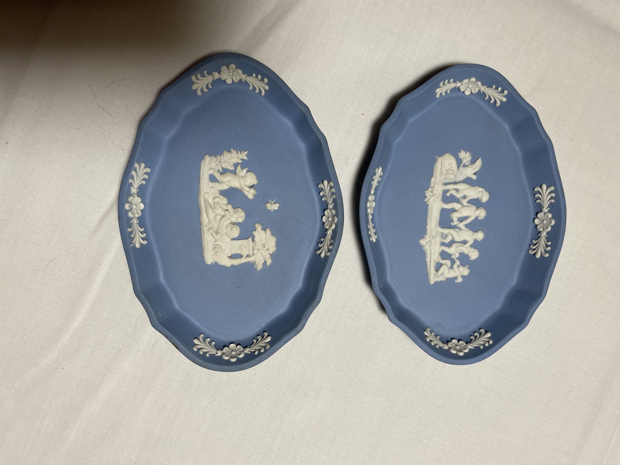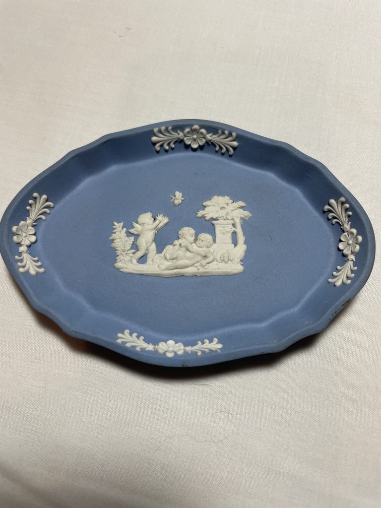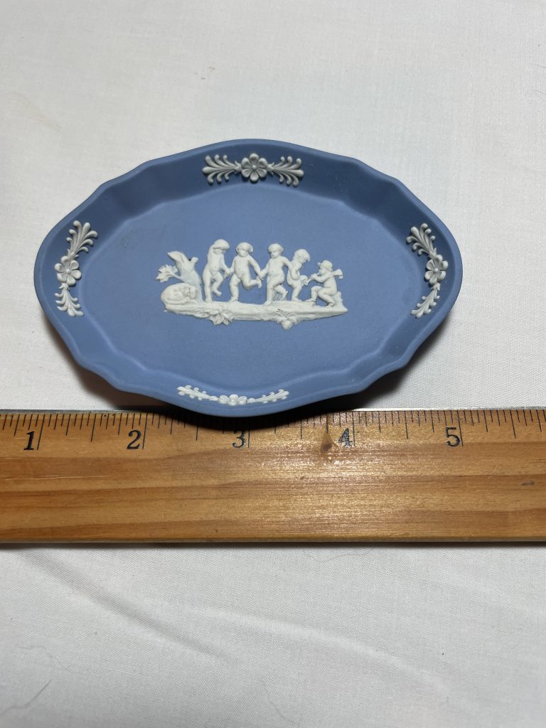 These Wedgwood trinket dishes are the perfect size for holding rings and other small items on a bedside table or vanity. Or, to be displayed with other pieces of Wedgwood Jasperware. Each measures approximately 4-1/8″ inches by 3 inches wide and is approximately one-half inch deep. One dish features little cherubs at play in nature, and the other has the cherubs dancing to a piper. Asking $30/set (shipping not included).