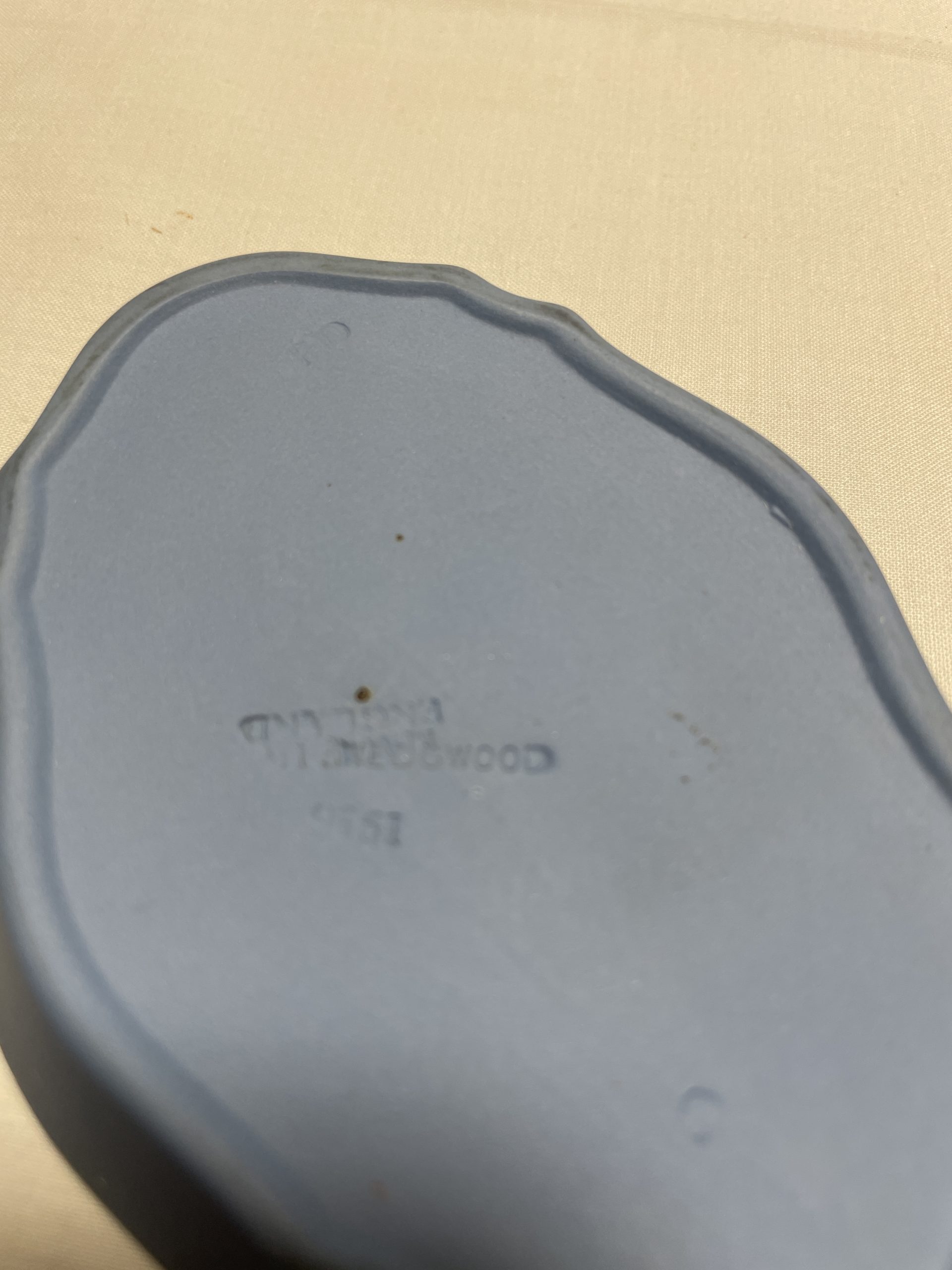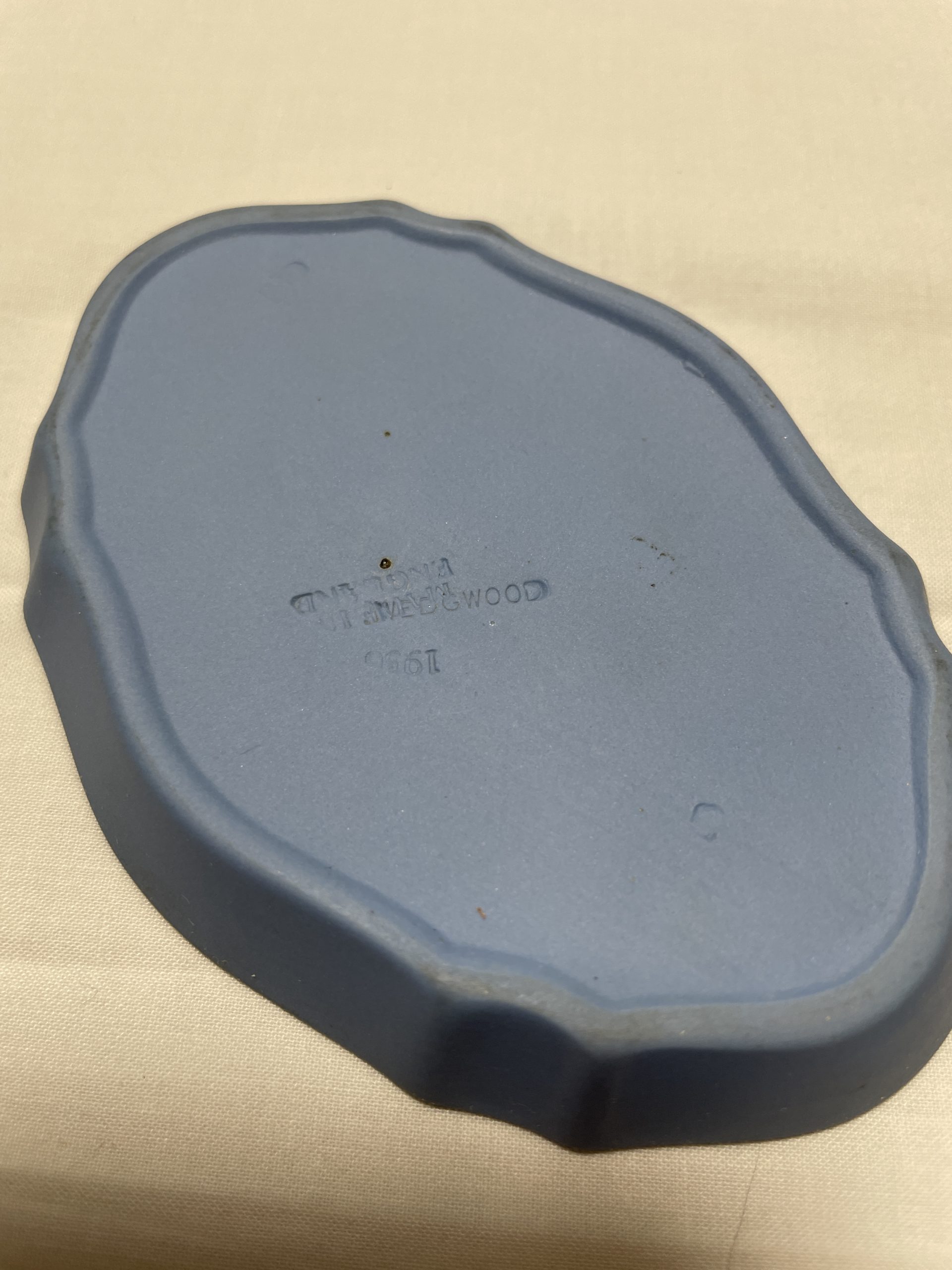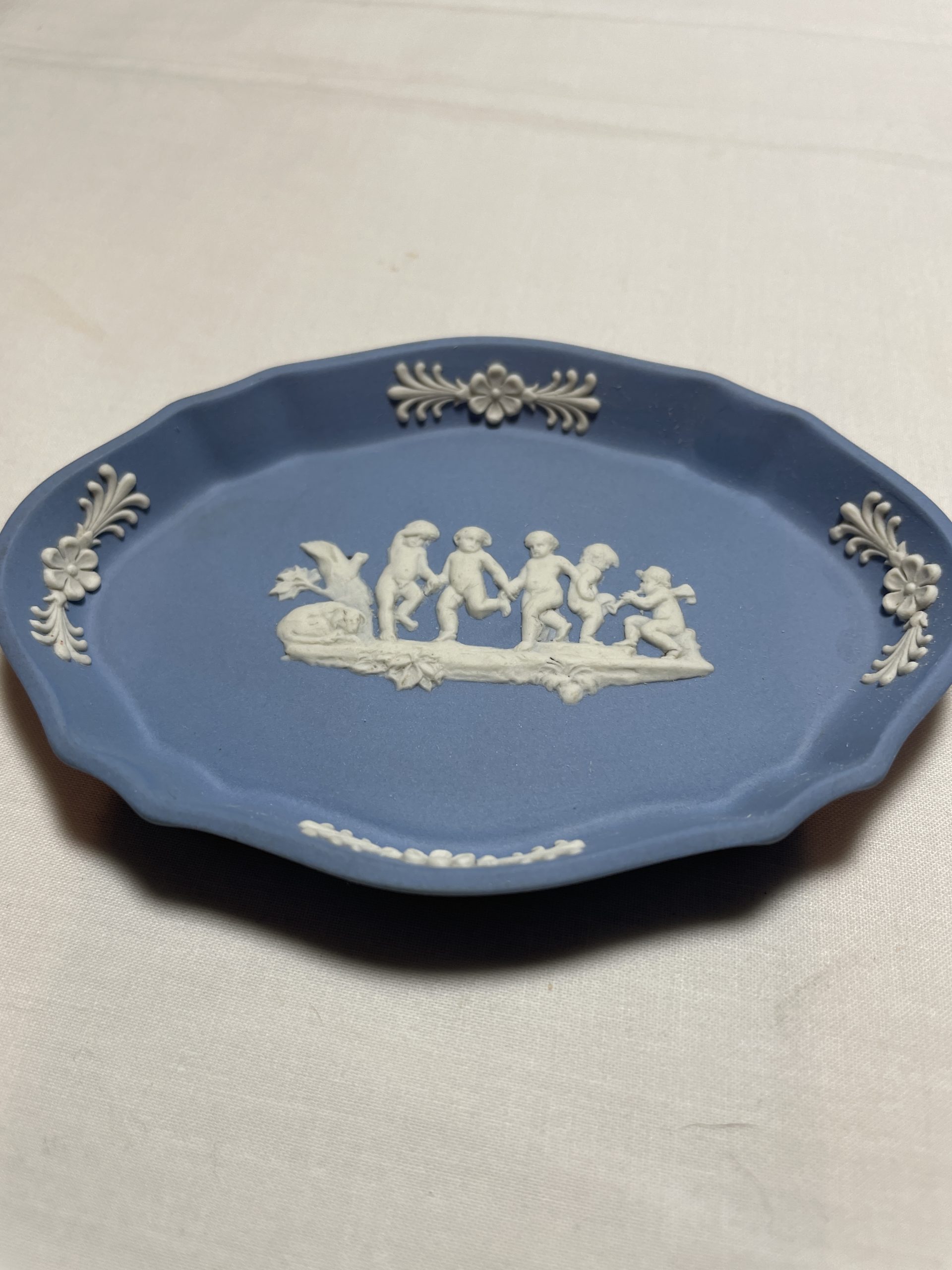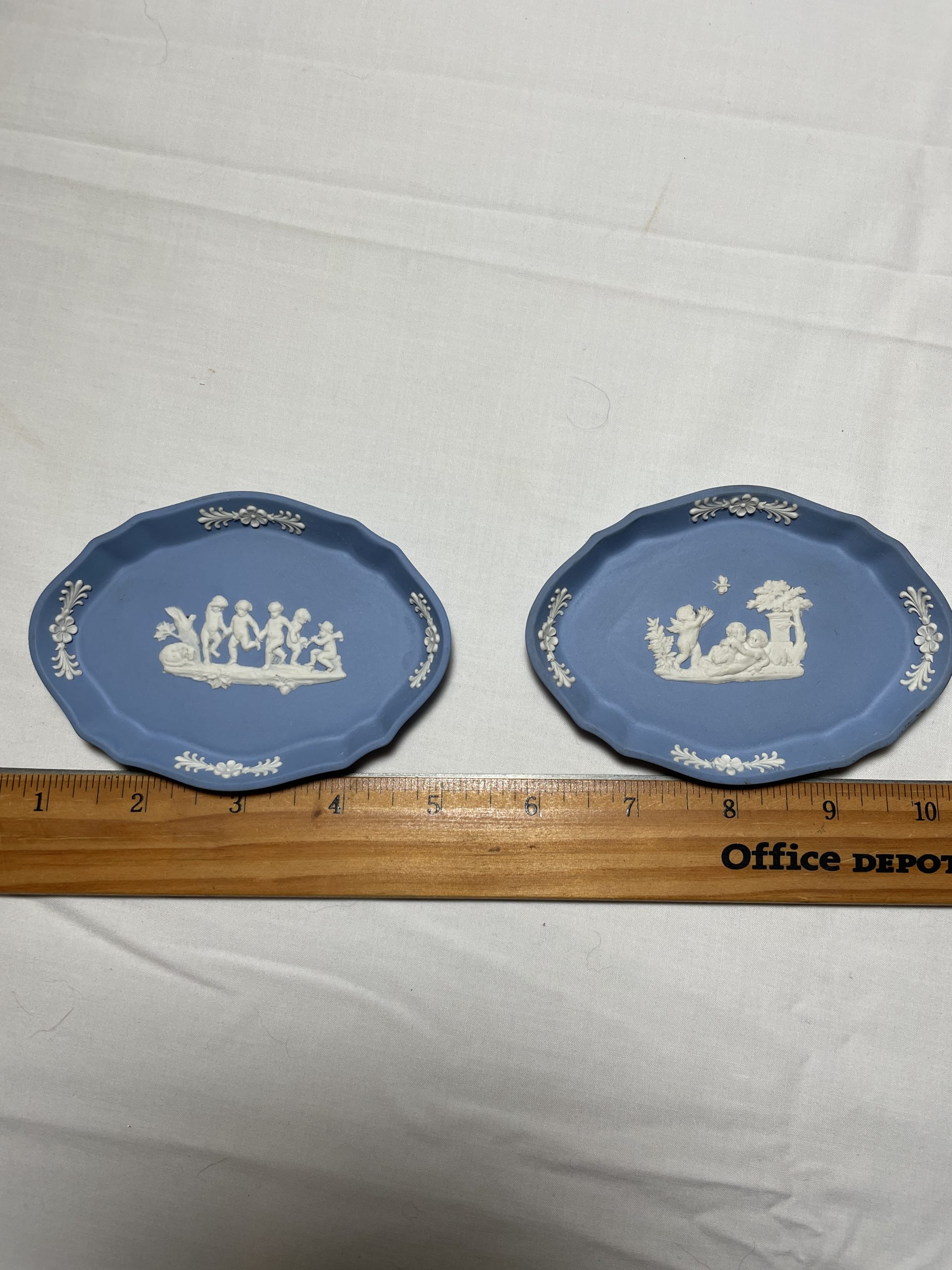 These Wedgwood trinket dishes are the perfect size for holding rings and other small items on a bedside table or vanity. Or, to be displayed with other pieces of Wedgwood Jasperware. Each measures approximately 4-1/8″ inches by 3 inches wide and is approximately one-half inch deep. One dish features little cherubs at play in nature, and the other has the cherubs dancing to a piper. Asking $30/set (shipping not included).
